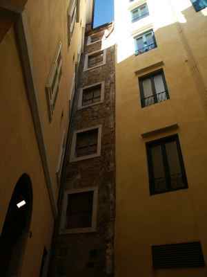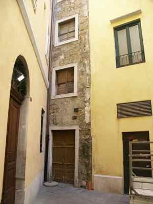 FACCIATA SU VIA BECCHERIE Basamento in pietra bianca bocciardata, rivestimento della fascia al piano terra in pietra bianca bulinata in corrispondenza del locale commerciale. Fori al piano terra con cornici arcuate in pietra bianca bulinata, decorate da chiavi di volta con volute in pietra. Architrave orizzontale sviluppato su tutta la lunghezza di facciata. Al centro un'iscrizione parzialmente leggibile (forse "MACELLERIA"). Sopraluce protetti da inferriate in ferro battuto. In corrispondenza del sopraluce del foro centrale, una lanternina in ferro battuto ed un'iscrizione recante la data 1851 (Pict0001.jpg). Banchina su mensole squadrate in pietra bianca a livello del primo orizzontamento, a protezione dell'ingresso al locale commerciale. Superficie di facciata trattata ad intonaco con marcapiano intonacato in corrispondenza del solaio del terzo piano. Serramenti oscuranti esterni in legno uso Trieste, montati su cornici in pietra bianca bulinata, con architrave a mensola al primo piano, architrave semplice ai piani superiori. Gronda e pluviale in lamiera. FACCIATA SU ANDRONA DEL PANE: Facciata trattata ad intonaco su tutta l'altezza. Fori architettonici con cornici semplici in pietra bianca bulinata. Porta di ingresso al piano terra in legno massello verniciato. Serramenti esterni dei piani superiori in legno senza oscuranti, ad otto specchiature con apertura a ghigliottina. INTERNO Scala con pianerottoli e gradini in lastre di pietra bianca bulinata e corrimano in ferro. Serramenti interni lignei e pavimenti in doghe di legno.