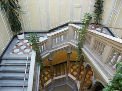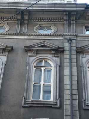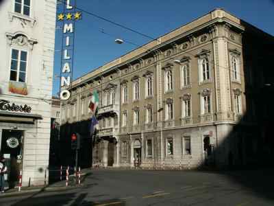 Serramenti esterni tutti in legno, di diverse tipologie: al piano terra doppie finestre rettangolari a quattro specchiature con cornice in pietra bianca bulinata ed inferriata in ferro battuto; al primo piano doppie finestre rettangolari a quattro specchiature, con edicola in pietra bianca a decorazione del foro architettonico e motivo geometrico a rilievo nella specchiatura sotto il davanzale in pietra; al secondo piano doppie finestre arcuate a sei specchiature, decorate da cornice a rilievo in pietra bianca e timpano triangolare nella parte superiore; al terzo piano finestre metalliche singole ellittiche con cornice in pietra bianca sul fronte principale (PICT0027.JPG), doppie rettangolari in legno con apertura ad anta sui fronti secondari. Finestre tutte rettangolari in legno con cornice semplice in pietra sui fronti affacciati sul cortile interno. Al piano terra finestre rettangolari con serramenti oscuranti in legno a doghe incrociate in corrispondenza del Bar Tartini sulla via Martiri della Libertà. Portali al piano terra in legno massello intarsiato, incorniciati da edicole in pietra bianca di diversa fattura. Fori commerciali con ampie vetrate con telaio e cassonetto in ferro verniciato. Serramenti interni in acciaio verniciato nelle aule e nelle parti comuni; in legno massello intarsiato, con cornici in marmo scuro o legno in corrispondenza dei locali di rappresentanza. Edicola decorativa sulla facciata principale sviluppata a tutta altezza in corrispondenza dell'ingresso (PICT0039.JPG). Paraste in pietra binate con motivi geometrici a forma piramidale a lato del portale ligneo a sostegno di quattro mensoloni a voluta, posti a loro volta a sostegno del balcone con parapetto in pietra bianca e balaustrini a sezione circolare. Balcone al secondo piano con due finestre arcuate binate, decorate da edicola con timpano triangolare. Marcapiano a livello del solaio del quarto piano con semplici modanature a dentello rompigoccia; sporto di linda con banchina in pietra bianca sostenuto da mensole a voluta e decorato da una doppia modanatura ad ovuli sovrastata da dentelli rompigoccia. Pluviali in acciaio zincato esterni in facciata lato strada solo tra il solaio del primo e del terzo piano, sotto forma di colonnine posizionate secondo i ritmi di facciata. Sulle altre facciate, pluviali e gronde in ferro verniciato. Atrio d'ingresso con pavimento in marmo di Aurisina, delimitato da colonne marmoree con capitello corinzio, sovrastato da soffitto decorato da motivi geometrici a stucco. Vano scala principale di carattere monumentale (PICT0056.JPG), sovrastato da volta a padiglione decorata con motivi a stucco con lucernario vetrato a specchiature rettangolari e lampadario a candelabro in ferro battuto; gradini in pietra bianca bulinata sostenuto da colonnine in marmo rosso con capitello corinzio e parapetto in pietra bianca con corrimano in ottone lucido recentemente applicato; pareti decorate con specchiature in spatolato alla veneziana e cornici in stucco. Pavimento intarsiato a motivi geometrici in marmo bianco, rosso e nero in corrispondenza dei pianerottoli. Anfore in pietra bianca ad uso fioriera a decorazione del parapetto dell'ultimo livello della scala. Vano scala secondario di tipo appoggiato con gradini in pietra bianca bulinata, pianerottoli in pietra d'Aurisina tipo "fiorita", parapetto in ferro verniciato con motivi a voluta e corrimano in legno. Scala di accesso al terzo piano di tipo appoggiato in calcestruzzo armato, con gradini rivestiti in pietra d'Aurisina tipo "fiorita", parapetto in ferro verniciato a bacchette verticali e corrimano in legno. Scala esterna di accesso all'appartamento del custode, di tipo a mensola, con gradini in pietra bianca, parapetto in ferro verniciato decorato a volute. Baldacchino in ferro verniciato a protezione della porta d'ingresso all'alloggio con copertura a due falde inclinate e gronda di raccolta acque meteoriche (PICT0031.JPG). Aula magna in stile barocco con volta a padiglione decorata da motivi a stucco e pietra bianca, ampie superfici specchiate, pavimento in legno intarsiato a motivi geometrici, lampadari e candelabri a parete con pendagli in cristallo e tendaggi in velluto pesante di colore scuro. Ampliamento con struttura in telaio di acciaio zincato e serramenti in alluminio verniciato colore marrone, vetrati a tutta altezza, suddivisi in specchiature rettangolari, formante nell'area centrale un patio rettangolare trattato a giardino. Nelle parti rinnovate, pavimenti in quadroni di linoleum, controsoffitti in listoni di alluminio, illuminazione a mezzo di lampade al neon. Nelle aule dell'ultimo piano, controsoffitti in cartongesso o pannelli eraclit.