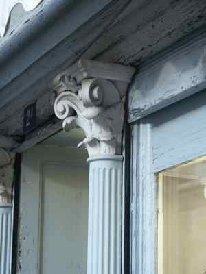 COLONNINE IN GHISA (esterno): Colonnine in ghisa verniciata con capitello corinzio (PICT0003.JPG). PARASTE (esterno): Paraste rifinite ad intonaco senza capitello suddividono la facciata in tre porzioni.