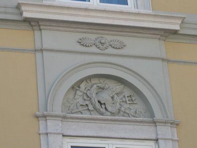 PANDURO (esterno) Il panduro collocato in chiave d'arco della Portizza raffigura un Ercole incappucciato da una testa di leone, con le zampe incrociate sotto al mento BASSORILIEVI (esterno) Un fregio a bassorilievo con motivi vegetali e allegorici corona la parte superiore del tetto. Le Lunette delle finestre del primo piano sono decorate con dei motivi allegorici a bassorilievo.