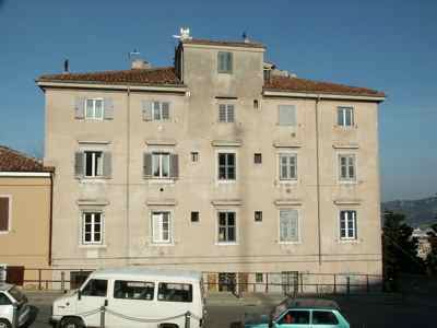 Corpo edilizio posto alle pendici del colle di S. Giusto, integrato nel borgo della città vecchia. Si sviluppa su quattro piani fuori terra, attico sopraelevato e livello interrato ad uso cantina. Strutture portanti verticali in muratura a sacco di pietra arenaria sbozzata a corsi suborizzontali, in mattoni pieni di laterizio in corrispondenza della sopraelevazione dell'attico. Orizzontamenti con strutture ad orditura singola e tavolato ligneo. Scala con elementi in pietra appoggiati su muratura portante laterale e setto centrale. Vani di servizio con affaccio diretto al vano scala in corrispondenza dei pianerottoli di interpiano. Copertura con puntoni appoggiati alla trave di colmo; orditura secondaria costituita da arcarecci e tavelle in cotto; manto di copertura in coppi curvi rossi. Facciate trattate in modo uniforme, basamento in pietra lungo l'intero corpo di fabbrica.