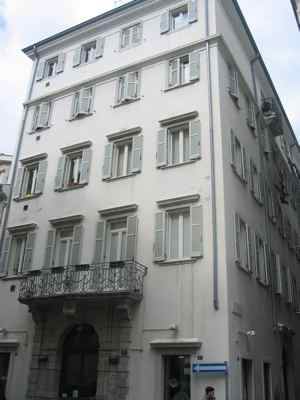 L'edificio sorge all'interno dell'ex Ghetto Nuovo, nella Contrada delle Ombrelle, la cui denominazione sette-ottocentesca deriva dalla presenza di un bresciano dedito alla riparazione di ombrelli, Giacomo Malgarini. La struttura risale alla fine del Settecento, periodo di forte espanzione per questa zona di Cittavecchia. L'ingresso principale del palazzo in origine su Piazza Vecchia, in seguito viene utilizzato per ospitare "una panca da macellaio ed una bottega di pizzicagnolo" (Tribel, 1885). Nell'edificio, sede del primo ufficio tavolare, abitava il registratore Francesco de Giuliani. Il pianoterra rimane destinato ad ospitare attività commerciali.