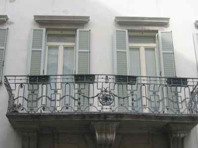 VOLUTE (esterno): Volute in pietra collocate in chiave di volta del portale principale e a sostegno del balcone soprastante. BALCONE (esterno): Balcone con parapetto in ferro battuto con decorazioni geometriche.