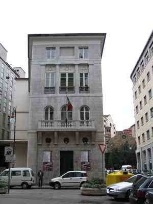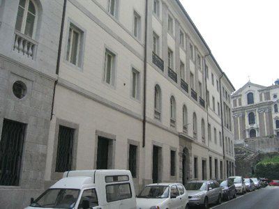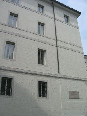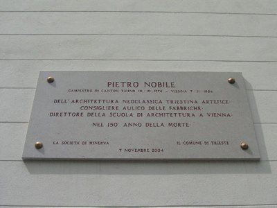 TARGA (esterno) lastra lapidea posta sul fronte interno verso il piazzale, recante incisa la scritta commemorativa "PIETRO NOBILE/ CAMPESTRO IN CANTON TICINO 10.10.1776 - VIENNA 7.11.1854/ DELL'ARCHITETTURA NEOCLASSICA TRIESTINA ARTEFICE/ CONSIGLIERE AULICO DELLE FABBRICHE/ DIRETTORE DELLA SCUOLA DI ARCHITETTURA A VIENNA/ NEL 150° ANNO DELLA MORTE/ LA SOCIETA' DI MINERVA IL COMUNE DI TRIESTE/ 7 NOVEMBRE 2004".