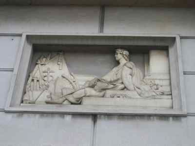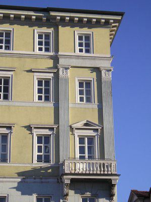 BALAUSTRA (esterno): Balcone con parapetto a balaustre ad anfora in corrispondenza delle parti aggettanti del primo piano. PARASTE (esterno): Paraste scanalate di ordine tuscanico tra primo e secondo piano in corrispondenza delle parti aggettanti. RILIEVI (esterno): Tondi decorativi raffiguranti le parti del mondo, opera di Pietro Zandomeneghi. Rettangoli scolpiti a bassorilievo da Giuseppe Moscotto e Giovanni Depaul rappresentano l'Onore, l'Industria, la Navigazione, la Riflessione, la Religione, la Costanza, la Beneficenza e il Commercio. I rilievi sono collocati negli spazi tra i fori architettonici del pianoterra.