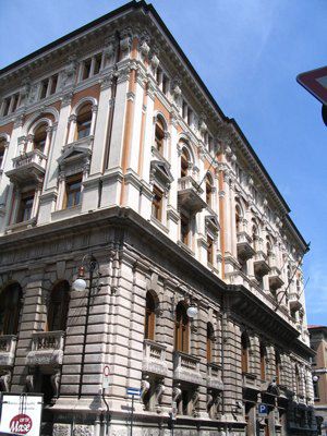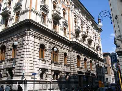 ISCRIZIONE (esterno) Sul parapetto del balcone del secondo piano della facciata principale è collocata l'iscrizione "CASSA DI RISPARMIO TRIESTINA" STEMMA (esterno) Sopra il portale d'ingresso stemma ovale con ape a rilievo e il motto "Lavora Raccogli Aumenta". ELEMENTI ORNAMENTALI (esterno) Riquadri decorativi con motivi geometrici e a nastri in corrispondenza delle specchiature tra i fori dell'ultimo piano. Motivi decorativi a greca alla base dei balconcini del primo piano. MENSOLE (esterno) Mensole a voluta in pietra bianca con testa d'uomo al quarto piano, con zampe e testa leonina al primo piano. Mensole a voluta in pietra bianca con motivo vegetale a sostegno dello sporto di linda e dei balconcini dei piani superiori. PANDURI (esterno) Mascheroni raffiguranti volto umano in chiave di volta in corrispondenza di alcune aperture del primo piano. LESENE (esterno) Lesene scanalate, rifinite a intonaco, con capitello corinzio a livello del secondo e terzo piano. SEMICOLONNE (esterno) Semicolonne scanalate, rifinite a intonaco, con capitello corinzio a livello del secondo e terzo piano del riquadro centrale della facciata principale. BALAUSTRE (esterno) Tutti i balconi sono ornati da balaustre in pietra con balaustrini ad anfora e pilastri angolari.