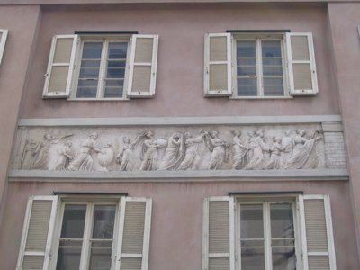 FREGI (esterno) I pannelli a bassorilievo raffigurano temi classici tratti dal repertorio antico quali baccanali, are sacrificali, cortei di suonatori e personaggi tratti dalla mitologia. BALAUSTRE (estreno) Su tutte le facciate la continuità della fascia marcapiano è spezzata da balaustre in ferro battuto a creare dei finti balconi. LESENE (esterno) Sul prospetto prospiciente via Roma sono presenti lesene lisce di ordine gigante con capitello ionico all'altezza del terzo e quarto livello
