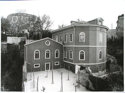Fascia basamentale trattata a finto bugnato liscio a corsi orizzontali e tinteggiatato color grigio. Facciata interamente intonacata e tinteggiata color verde pastello, spezzata da due marcapiani modanati in pietra bianca e una cornice a fascia continua in pietra calcarea bianca posta tra i fori del terzo livello e la linda. Tra la cornice e la linda tredici anelli modanati in pietra bianca (IMG_0985). Volume secondario interamente intonacato e tinteggiato color verde pastello. L'accesso è garantito da una scala con gradini in pietra bianca bulinata che termina in un pianerottolo in lastre di pietra arenaria. Giardino retrostante pavimentato in lastre di pietra arenaria; giardino antistante in lastre grezze di pietra arenaria. Serramenti in alluminio color bianco a due specchiature con, al secondo e terzo livello, sopraluce. Nella fascia basamentale il foro che dà sulla scala presenta un'inferriata in ferro battuto. Fori del secondo e terzo livello ad arco con cornice in pietra bianca. Nel fabbricato secondario fori del primo livello rettangolari, di cui solo uno con cornice in pietra c Calcarea bianca. Al livello superiore fori ad arco con cornice in pietra bianca. Superiormente un foro orbicolare con cornice in pietra bianca e serramenti a due specchiature. Portone d'ingresso su Via dell'Asilo in ferro a due battenti (IMG_0965). Accesso all'edificio tramite una porta in alluminio color bianco a due battenti. Accesso al piano inferiore del fabbricato secondario con portoncino in alluminio verniciato grigio. Linda in calcestruzzo. Grondaia e pluviali esterni in lamiera verniciata color marrone. All'interno corridoi e servizi pavimentati con piastrelle (IMG_0975); aule e mensa con linoleum (IMG_0976). Scala in pietra bianca bulinata retta da volte in pietra (IMG_0972). Trave in acciaio a sostenere lo sbalzo delle rampe. Parapetto in ferro battuto con corrimano in legno.