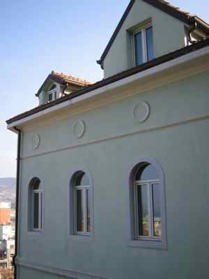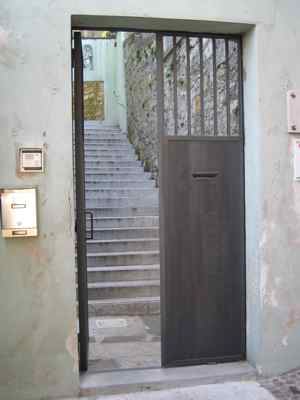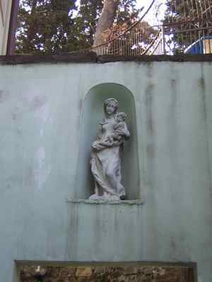 ANELLI MODANATI (esterno): Anelli modanati in pietra bianca posti in facciata sotto la linda (IMG_0985). SCULTURA RAFFIGURANTE MADONNA CON BAMBINO (esterno): Scultura in pietra raffigurante la Madonna con bambino. Inserita in una nicchia ricavata nel muro che sovrasta la scaletta che conduce al giardino retrostante (IMG_0977).
