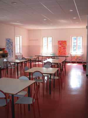 FABBRICATO PRINCIPALE Basamento in pietra bianca bulinata. Fascia superiore in bugnato a conci di pietra arenaria. Un marcapiano modanato in pietra bianca, che sovrasta un fregio continuo dentellato, segna la divisione dal resto della facciata. Essa è interamente rivestita in mattoni faccia a vista con alcuni elementi in pietra bianca a marcare le paraste. Elementi in pietra bianca inseriti anche tra gli archi ribassati dei fori dell'ultimo piano. Facciata su Via Ressel cieca. Parapetti delle due terrazze su Via Combi in pietra bianca. Banchina in pietra retta da coppie di reggimensole lavorate a volute, emergenti da un doppio fregio continuo dentellato. Bocche di lupo con inferriate nel basamento. Primi due livelli con fori arcuati a tutto sesto con serramenti in legno verniciato color bianco a nove o undici specchiature. Al primo livello due fori di dimensioni più ridotte a lato del portone sul cortile e nei volumi laterali: serramenti sempre lignei verniciati color bianco a cinque o tre specchiature. Al secondo livello di Via Combi doppi serramenti nel corpo centrale. Nel corpo laterale destro due bifore con serramenti in legno a tre specchiature. I restanti tre livelli hanno fori ad arco ribassato con davanzale e chiave di volte in pietra bianca; doppi serramenti in legno verniciato color bianco a undici specchiature. Nei corpi laterali che si affacciano sul cortile trifore e quadriforme con serramenti in legno a tre specchiature. Nel corpo laterale sinistro fori arcuati a tutto sesto o ad arco ribassato con serramenti lignei a tre specchiature. Portoni d'ingresso lignei a due battenti ciascuno e sopraluce. I fori arcuati sono tutti con cornice in pietra bianca modanata e pensilina sovrastante in legno che poggia su due reggimensole a volute in pietra bianca (IMG_1019). Gronda e pluviali esterni in lamiera. Doppio accesso su Via Combi. Corridoi pavimentati alla veneziana; aule con pavimenti in listelli di legno oppure con linoleum e controsoffitti in doghe d'alluminio. Corridoi occasionalmente inframmezzati da pareti lignee (IMG_1049). Scale nei corpi laterali. Sono di tipo appoggiato con trave d'acciaio di sostegno. Gradini in pietra bianca bulinata. Parapetto in ferro verniciato color bianco con passamano in legno (IMG_1046). RICREATORIO Basamento in pietra bianca bulinata. Fascia superiore in bugnato a conci di pietra arenaria. Rimanente parte di facciata rivestita in mattoni faccia a vista con conci di pietra arenaria a marcare gli spigoli del fabbricato. Scala laterale di accesso diretto al primo livello in pietra bianca bulinata con parapetto interamente in ferro. Facciata su Via Ressel cieca con solo sei piccoli fori rettangolari di recente fattura con serramenti in alluminio a unica specchiatura. Primo livello con fori arcuati a tutto sesto con serramenti in ferro verniciato color verde e sopraluce; inoltre fori rettangolari con serramenti in legno verniciato color verde a due specchiature con inferriate verniciate color verde. Una porta in ferro permette l'accesso al primo livello. Fori arcuati a tutto sesto nella struttura della scala con serramenti in legno a quattro specchiature o tamponati da assi di legno. Nel raccordo di collegamento con l'edificio principale fori rettangolari tamponati da tavolati dipinti. Secondo livello con fori arcuati a tutto sesto con davanzale in pietra bianca. Doppi serramenti in legno color bianco a quattro specchiature e sopraluce, la maggior parte dei quali provvista di oscuranti in legno verniciati color verde. Scala interna rivestita di linoleum antiscivolo con parapetto in ferro color verde. Corridoi, stanze e aule gioco pavimentate con quadrettoni di linoleum; controsoffitti costituiti da pannelli di fibre minerali. Palestra del livello inferiore con superficie in parquet.