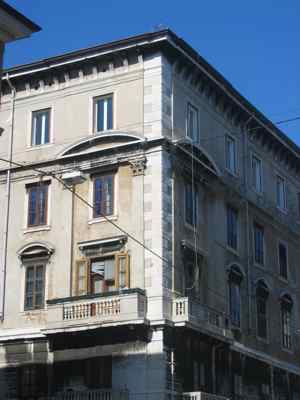 BALCONE (esterno): Balcone con parapetto a balaustre in pietra al primo e secondo piano della facciata su Via Trento. LESENE (esterno): Lesene di ordine gigante con capitello corinzio al secondo e terzo piano della facciata su Via Trento.
