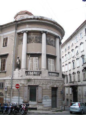 Pertsch si trovò ad operare in un lotto di terreno a cuneo altimetricamente malagevole nel tessuto urbano frammentario e irregolare della città medievale. Per prima cosa egli realizzò un piano orizzontale, costituito dal piano terra a bugnato, sul quale appoggiare la costruzione. Sull'angolo acuto del lotto, Pertsch progettò una facciata semicircolare con colonne ioniche di ordine gigante. Le colonne sono addossate al muro nel quale si aprono tre porte finestre con balaustra tra i basamenti delle colonne stesse e, nella parte superiore, dei bassorilievi. Nello spazio tra le colonne esterne e la muratura delle facciate laterali, sono collocate due statue raffiguranti Marte e Minerva. Il colonnato sostiene una cornice spessa fortemente aggettante che presenta decorazione a ovuli e una fascia a dentelli. All'interno dell'edificio, in corrispondenza della facciata convessa, si trova una sala circolare voltata a cupola con affreschi attribuiti a Giuseppe Gatteri, così come gli affreschi di ispirazione pompeiana che si trovano in una saletta attigua.