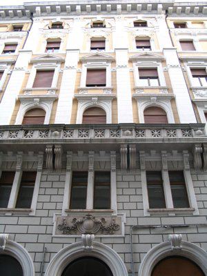 ELEMENTI ORNAMENTALI (esterno) Decorazioni floreali e a motivi geometrici in rilievo negli spazi tra le aperture. STEMMA Sopra il portone d'ingresso principale, su via Paganini, riquadro con stemma circolare accompagnato da volute e festoni di frutta. BALAUSTRE I balconi presentano balaustre in pietra con motivi stellari traforati.