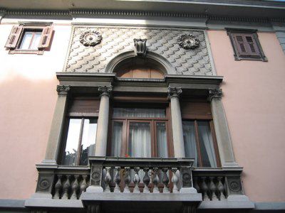 SERLIANA (esterno): Struttura a serliana costituita da balaustra in pietra aggettante nella parte centrale, caratterizzata da colonne libere ed ai lati semipilastri con capitello ionico. La chiave di volta dell'arco a tutto centro è arricchita da una mensola a voluta. La specchiatura superiore in pietra presenta una decorazione a motivi geometrici con parti in rilievo raffiguranti elementi floreali e due ghirlande simmetriche rispetto l'arco centrale. BALAUSTRA (esterno): Parapetto in pietra a balaustra in corrispondenza della terrazza superiore. VERANDA (esterno): Veranda con struttura di sostegno in pietra caratterizzata da pilastri con capitello ionico, copertura lignea in corrispondenza della terrazza del secondo livello della facciata posteriore. TORRETTA (esterno): Torretta circolare su cui si aprono due solo finestre e terminante con struttura a colonne libere di ordine ionico e copertura lignea. CANCELLO (esterno): Cancello in ferro battuto decorato da motivi geometrici e floreali.