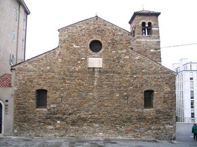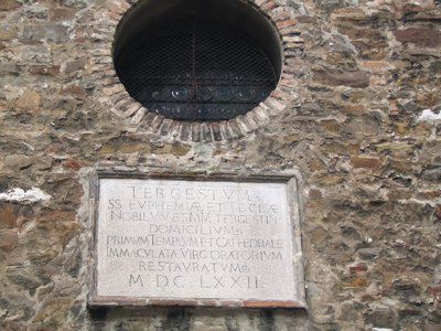 LAPIDE (esterno) Lapide posta dai Gesuiti nel 1672 recitante " TERGESTVM SS. EVPHEMIAE ET THECLAE NOBIL, VV. ET MM. TERGESTIN. DOMICILIVM PRIMVM TEMPLVM ET CATHEDRALE IMMACVLATAE VIRG. ORATORIVM RESTAVRATVM M.D.C.L.XXII." AFFRESCO (interno) Frammenti di pitture ad affresco trecentesche raffiguranti una scena relativa alla vita dell'imperatore Costantino e una probabile Annunciazione. ROSONE (esterno) Rosone con raggiera ad archi a tutto sesto sulla facciata principale. COLONNE (interno) Colonne in pietra con capitello cubico suddividono le navate interne. PROTIRO (esterno) Protiro romanico in pietra bianca con colonne a sostegno dell'arco a tutto sesto.