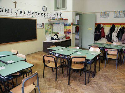 L'edificio in località Trebiciano è un fabbricato a due piani con ampio cortile sul retro, restaurato di recente si presenta in uno stile molto sobrio e lineare. Il problema delle scuole slovene fu molto sentito, soprattutto nelle zone rurali limitrofe la città, che, prive di idonei edifici scolastici, avevano più volte chiesto al Comune la possibilità di erigere i propri istituti. La scuola con insegnamento in lingua slovena fu alla fine realizzata con modestia di mezzi nel 1871 allorquando ne venne decretata la costruzione sul fondo N. Tav. 677. Negli anni cinquanta subì un primo intervento di restauro per i danni subiti durante il recente conflitto. Risale al 1972 il progetto di un nuovo muro di cinta e la posa di una stele con busto bronzeo di "Pinko Tomazic" in occasione della nuova denominazione della scuola elementare di Trebiciano per conto dell'associazione degli alunni della scuola stessa. Attualmente ospita la scuola elementare statale con lingua di insegnamento slovena P. Tomazic e la scuola elementare statale U. Polonio.