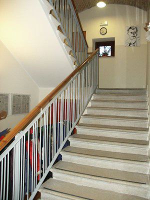 CORPO DI FABBRICA PRINCIPALE Fascia basamentale rivestita in pietra di Aursina a conci squadrati e corsi regolari orizzontali con finitura a spacco di cava. Fori architettonici con piattabanda interna ad arco ribassato e con cornici esterne in pietra di Aurisina bulinata; serramenti esterni vetrati lignei a doppia anta con sei specchiature vetrate, verniciati al naturale, di recente fattura. Superficie di facciata rifinita ad intonaco liscio sino all'intradosso di copertura; banchina in lastre di pietra di Aurisina, gronde e pluviali in lamiera verniciata esterni alla muratura perimetrale; manto di copertura in coppi curvi rossi uso Trieste. Pavimentazione interna in legno, in listoni a correre, di fattura uniforme in tutti gli ambienti. Scala interna con gradini in pietra calcarea e pianerottoli di interpiano in lastre di pietra bocciardata; parapetto metallico verniciato con corrimano ligneo. Superfici murarie trattate ad intonaco pitturato color bianco con abbassamento in smalto murale grigio chiaro. Serramenti interni di recente fattura con pannellature rifinite in laminato plastico. Spazio del sottotetto con ampia vetrata in cristallo di sicurezza, affacciata sugli spazi delle aule sottostanti. PORTICATO ESTERNO Porticato esterno con struttura verticale ed orizzontale lignea; copertura a doppia orditura con travatura principale perimetrale a correre e travatura secondaria trasversale con tavolato e manto in lamiera verniciata. Superficie di calpestio in tavolato ligneo verniciato naturale, posizionato in senso trasversale e parapetto metallico verniciato grigio. CORPO DI FABBRICA SECONDARIO Finiture molto simili a quelle del corpo principale. Basamento in pietra bianca a conci integrati nella muratura (non a rivestimento), fori architettonici rifiniti ad intonaco con davanzale in pietra calcarea, serramenti esterni lignei verniciati al naturale a doppia anta a sei specchiature con sopraluce bipartito; orditura principale e secondaria di copertura e tavolato ligneo a vista in corrispondenza dello sporto di gronda. Le superfici murarie interne risultano integralmente intonacate in colore bianco; la sala destinata ad uso palestra, presenta un pavimento rifinito in parquet ligneo; le altre superfici orizzontali risultano rifinite in piastrelle di ceramica a giunti uniti.