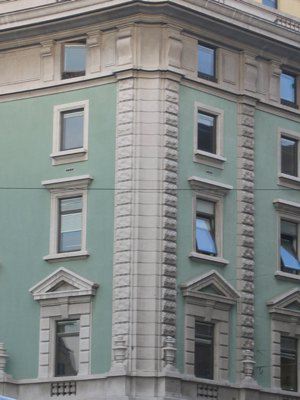 BALCONE (esterno): Balcone a balaustra, arricchito da due vasi laterali, su cui si apre una porta finestra a arco a tutto centro con mensola in chiave di volta inquadrata da semipilastri a bugne con capitello ionico e conclusa da una trabeazione in pietra al centro del terzo piano del prospetto principale. BALCONE (esterno): Balconata a balaustra con colonnine in pietra in corrispondenza dell'ultimo piano. VASI (esterno): Vasi a decorazione del balcone centrale e degli angoli a bugnato del terzo piano. MENSOLE (esterno): Mensole a voluta a decorazione del coronamento della superficie muraria.