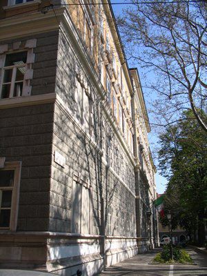 L'immobile si presenta come una struttura a corpo unico con pianta rettangolare allungata. La costruzione copre un intero grande isolato e si sviluppa per cinque piani fuori terra. Le facciate principali, prospettanti piazza Hortis e via Diaz, sono tripartite con la parte centrale sporgente e sopraelevata. Anche agli angoli le facciate presentano una lieve sporgenza. La superficie del pianoterra e del primo piano è trattata a falso bugnato, mentre la parte superiore dell'edificio è intonacata in giallo. Al piano terra si aprono quattro portali ad arco sormontati da timpano. Le finestre del secondo piano, e quelle centrali del terzo piano, sono sormontate da frontoni triangolari. L'attico presenta una decorazione a bassorilievi tra le finestre ed è coronato da una balaustra con cartella centrale. La struttura verticale è in muratura, mentre i solai sono in legno e in ferro. La copertura è realizzata con una struttura portante in legno.