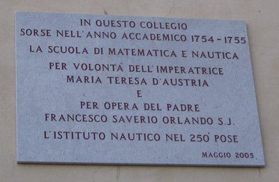 LAPIDE (esterno) Sul lato sinistro dell'edificionel maggio del 2005 è stata collocata una lapide recante la scritta " IN QUESTO COLLEGIO SORSE NELL'ANNO ACCADEMICO 1754-1755 LA SCUOLA DI MATEMATICA E NAUTICA PER VOLONTA' DELL'IMPERATRICE MARIA TERESA D'AUSTRIA E PER OPERA DEL PADRE FRANCESCO SAVERIO ORLANDO S.J. L'ISTITUTO NAUTICO NEL 250° POSE".