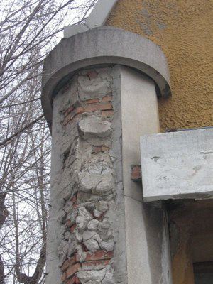 BUGNATO (esterno): basamento trattato a bugnato sul prospetto lungo viale Sanzio. MARCAPIANO (esterno): fasce lapidee orizzontali che si alternano ai corsi in laterizio sulla facciata lungo viale Sanzio. PARASTE (esterno): in cemento armato e laterizi, con rivestimento lapideo; caratterizzano e scandiscono la facciata sul viale Sanzio. PARASTE (esterno): in cemento armato e laterizi; si collocano sui lati corti dell'edificio e presentano una finitura ad intonaco della stessa tonalità delle facciate e alla base una fascia non intonacata. COLONNE D'ANGOLO: in cemento armato e laterizi, con rivestimento lapideo. L'elemento verticale si conclude con una sorta di capitello costituito da due elementi lapidei cilindrici di forma e dimensioni diverse. CORNICE (esterno): elemento lapideo a livello della linea di gronda che sottolinea l'attacco della copertura, leggermente sporgente rispetto al filo della facciata. TIMPANO TRAPEZOIDALE (esterno): elemento che si innalza rispetto alla copertura sui due lati corti dell'edificio, intonacato della stessa tonalità delle facciate. STEMMA (esterno): elemento lapideo posto sul prospetto lungo viale Sanzio, raffigurante un'alabarda e recante la scritta in rilievo "1933"