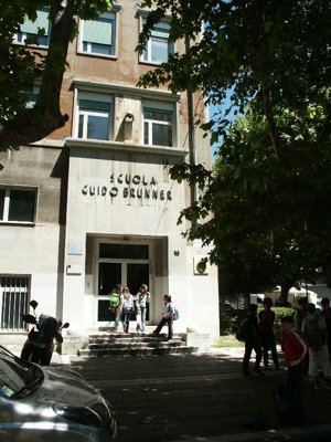 ISCRIZIONE (esterno) In corrispondenza dell'ingresso principale sulla Via delle Ginestre, un'iscrizione in caratteri metallici riporta la seguente dicitura: "SCUOLA GUIDO BRUNNER". TARGA (esterno) Una targa bronzea con un tondo decorativo è affissa sul lato destro dell'ingresso principale e riporta la seguente dicitura: "DURANTE L'OCCUPAZIONE TEDESCA (1943-1945) QUESTA SCUOLA FU TRASFORMATA IN PRIGIONE. QUI CENTINATA DI PATRIOTI STAVANO IN ATTESA DI ESSERE DEPORTATI NEI CAMPI DI STERMINIO NAZISTI. L'A.D.P.P.I.A. POSE IL 26 GENNAIO 2003". BUSTO (interno) Nell'atrio di ingresso, su una mensola in pietra di Aurisina si erge un busto in pietra scura raffigurante il volto di Guido Brunner. BUSTO (interno) Nell'atrio dell' ingresso secondario, su una mensola in pietra bianca bocciardata, si erge il busto raffigurante il volto di Fran Erjavec. LAPIDE (interno) Nell'atrio di ingresso secondaria, una lapide in pietra di Aurisina riporta la seguente dicitura in lingua slovena: "V CASU KI NAJ SE NE POVRNE. V CASU. KI JE ZAPISAN V NAS S PREPOVEDMI. POZIGI. KRVJO. SO SE NASILJU Z NASILJEM UPRLI STIRJE JUNAKI KI SO VERJELI V SVOBODO IN PRAVICNEJSI SVET. FERDO BIDOVEC. FRANJO MARUSIC. ZVONIMIR MILOS. ALOJZ VALENCIC. USTRELJENI V BAZOVICI OB ZORI 6. SEPTEMBRA 1930. NJIHOVA KRI JE KLILA V SEMENJU ZA ZMAGOVITI OSVOBODILNI BOJ SLOVENSKEGA NARODA. TEBE NJIHOVA ZRTEV ZAVEZUJE. DA ZIVIS PROST IN PONOSNO IN DA NIKDAR NE ZAMRE SPOMIN NA CAS. KI NAJ SE NE POVRNE. POSTAVILI UCITELJI IN STARSI 3. DECEMBRA 1978". A fianco della lapide sono affissi quattro piatti decorativi in bronzo sbalzato.