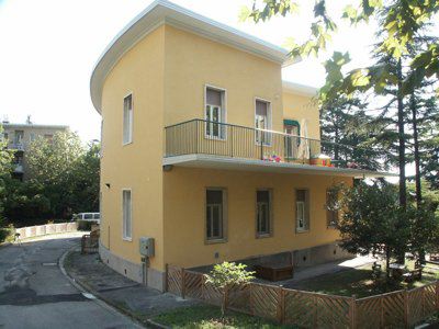 ISCRIZIONE (esterno) Sull'affaccio principale, nello spazio compreso tra le porte-finestra del primo piano e l'aggetto del coronamento, a caratteri stampatello bianchi rifiniti in intonaco è riportata la seguente dicitura: "CASA DELLA MADRE E DEL BAMBINO".