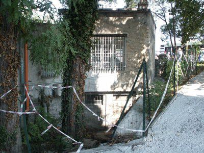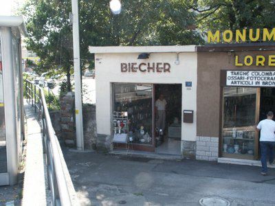 Le notizie inerenti il semplice edificio ubicato in via dell'Istria 137 sono veramente scarse. La strada che da S. Giacomo porta ai cimiteri fu aperta nel lontano 1775 e mantenne il nome di Strada Postale fino al 1901. Allargata e corretta su intervento comunale già nel 1897, fu quindi intitolata all'omonima regione geografica. Nel 1825, così come riportato negli annali del Kandler, avveniva la benedizione del Cimitero di Sant'Anna con il quale "cessava il Cimitero antico che era presso il Duomo e cessavano le fosse con calce viva alla Gioseffiana, che si teneva a Zaule". I primi progetti rinvenuti presso l'Archivio tecnico del Comune ci riportano l'esistenza, nel 1935, di un fabbricato monopiano prospiciente l'incrocio e risalente, molto probabilmente, ad epoca anteriore, destinato ad ospitare un'attività di scalpellino a favore del cimitero colà esistente. Il progetto in questione si riferisce alla costruzione di una tettoia, demolita successivamente nel 1974 così come riportato nella dicitura progettuale: "Demolizione tratto tettoia facente parte del laboratorio di scalpellino della ditta O. Biecher, Monumenti e lapidi".