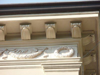 STEMMA Al centro della grata metallica del sopraluce del portone d'ingresso vi sono due iniziali in ferro "JP". CORNICE Sotto la linea di gronda, lungo tutto il perimetro dell'edificio, si sviluppa una fascia con decorazioni lapidee in rilievo, raffiguranti ghirlande, elementi vegetali e nastri.