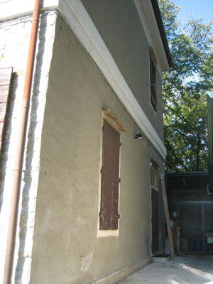 Basamento in intonaco bugnato bianco, cornice marcapiano tra il primo ed il secondo livello. La copertura presenta una cornice di coronamento in intonaco bianco e abbaini. Le apertura sono regolari con cornici in pietra bianca, serramenti in pvc bianco e scuri lignei a due battenti verniciati in marrone, con specchietti orientabili al primo livello; inoltre, tutte le aperture presentano una piccola tettoia in lamiera dipinta di bianco ed inferriate metalliche verniciate di bianco al piano terra. Un terrazzino è collocato al primo livello dell'affaccio principale ed è sostenuto da due mensole laterali a voluta e ringhiera metallica con piccoli decori geometrici.
