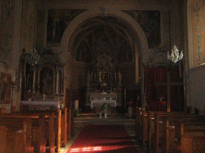Gli elementi architettonici sono distribuiti all'esterno e all'interno della chiesa. Un campanile posizionato in facciata rappresenta l'elemento architettonico di maggior importanza, tale struttura è sostenuta da quattro pilastri collegati tra loro da archi a tutto sesto. Una fascia marcapiano in pietra bianca e alcune piccole aperture con cornici in pietra decorano il fusto del campanile, mentre in sommità si collocano delle bifore con capitelli di ordine dorico, un orologio e una balaustra lapidea con colonnine. La copertura è composta da un cono esagonale con fori circolari chiusa da una croce in ferro. La facciata principale e quelle secondarie presentano piccole aperture a forma di semicerchio poste in sommità dell'affaccio; su una delle facciate laterali si colloca un ingresso secondario e alcune finestre ad arco di forma allungata. La lunetta superiore all'ingresso principale presenta un dipinto raffigurante una scena del Vangelo e due cammei laterali raffiguranti i visi di due santi. Internamente lo spazio è decorato con dipinti su tutte le superfici del soffitto e per larga parte delle pareti, l'abside è composto volte a vela dipinte; tre altari in marmo chiudono centralmente e lateralmente la navata; il coro, in posizione rialzata sorretto da due colonne in marmo, presenta decori pittorici all'esterno della balaustra lignea. Pavimentazione in pietra, pareti e soffitto con fondo ad intonaco.