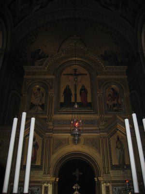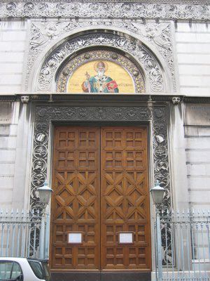 AFFRESCHI (interno): Affreschi raffiguranti "Cristo Pantocratore" con gli "Angeli reggicartigli" nella cupola centrale, nelle absidi laterali "San Spiridione al concilio di Nicea" e la "Vergine Assunta". Nella superficie superiore dell'ingresso la "Tomba di San Spiridione" e al di sopra delle porte laterali le immagini del "Profeta Elia" e il "San Giovanni Battista". I rimanenti mosaici della facciata principale rappresentano i "Quattro Evangelisti" e il "Padre Eterno". ICONOSTASI (interno): Iconostasi formata da dipinti raffiguranti la "Crocefissione" al centro ed ai lati la "Resurrezione" e il "Battesimo di Cristo". A completamento della struttura si trovano quattro icone che rappresentano "San Spiridione, la "Vergine col Bambino", "Cristo Re" e l'"Annunciazione". MOSAICI (esterno): Mosaici raffiguranti "San Spiridione" al di sopra dell'ingresso principale, "San Michele Arcangelo" e i "Santi Atanasio" e "Gregorio Nazianzeno" nelle lunette laterali. Sulla parete destra si trovano le raffigurazioni della "Madonna con Bambino" e i "Santi Basilio" e "Giovanni Crisostomo". I mosaici rimanenti rappresentano teorie di santi. SCULTURE (esterno): Statue di "Santi" a decorazione delle nicchie della facciata principale.
