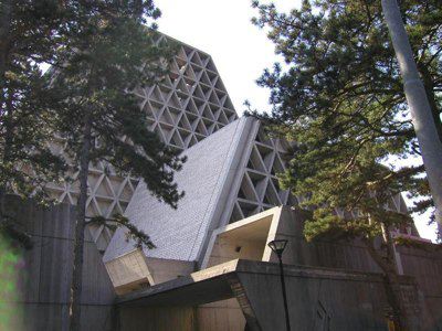 L' architettura del tempio sacro è basata su moduli triangolari rigorosamente calcolati che, ripetendosi nelle stesse proporzioni, compongono non solo la costruzione, ma anche ogni suo singolo arredo. La massa volumetrica è caratterizzata da equilibrio ed armonia e, nonostante la sua imponenza di 48.000 metri cubi, risulta leggera e ariosa, grazie al reticolato delle travi in cemento armato disposte a triangolo che le conferiscono l'aspetto di una trina trasparente. La struttura è costituita da due chiese sovrapposte, l'inferiore e la superiore, entrambe con pianta a croce greca. Le due aule di culto sono collegate tra loro da una scala interna, ma hanno anche ingressi indipendenti. La cella campanaria è costituita da un prisma capovolto che s'incunea nella copertura della campata.