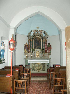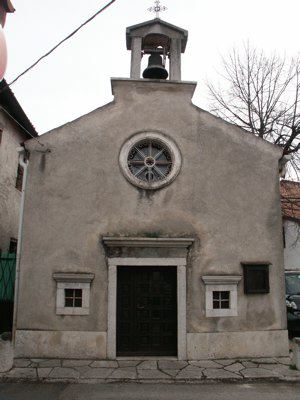 ISCRIZIONE (esterno): L'architrave del portale di accesso riporta l'incisione con la data 1789. STEMMA (esterno): In sommità della piccola torre campanaria è incisa l'alabarda di Trieste. ELEMENTO ORNAMENTALE (esterno): Sopra la croce in sommità della facciata è posto un indicatore di direzione del vento a forma di gallo in ferro battuto. DIPINTI (interno): Appesi alle pareti dipinti su tavola lignea raffigurano la Via Crucis. ISCRIZIONE (interno): In chiave di volta sopra l'arco che separa l'altare dall'aula, un'iscrizione riporta le parole "Leto Gospodovo 1999", probabile data risalente all'ultima risistemazione interna. ELEMENTO ORNAMENTALE (interno): Un crocifisso con simboli dell'opera e del lavoro dell'uomo è appeso alla parete d'ingresso. STATUA (interno): Una statua della Madonna con Bambino è posizionata nella nicchia in corrispondenza della finestra sul lato sinistro. DIPINTO (interno): Un dipinto su tavola con cornice barocca raffigura la sacra famiglia protetta dall'alto da Dio e dallo spirito santo in forma di colomba.
