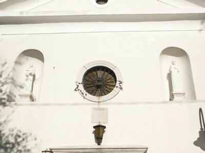 EPIGRAFE (esterno) Sopra il portale un'epigrafe in pietra datata 1634 è posta a memoria del vescovo Coronini. STATUE (esterno) Due figure in pietra bianca poste all'interno di nicchie che fiancheggiano l'ingresso della chiesa raffigurano F. Baraga e A. M. Slomþek. AFFRESCHI (interno) Decorazioni a fresco decorano la volta della navata, dove è raffigurata l'Assunzione e la crociera dell'abside, dove sono raffigurati i busti degli evangelisti.