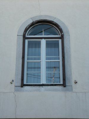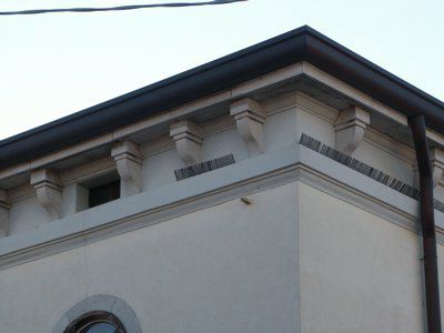 Le facciate sono trattate ad intonaco liscio color rosa sui quattro lati. Sul fronte principale un bassissimo battipiede in pietra calcarea protegge l'attacco a terra dell'edificio da danneggiamenti accidentali. Un alto marcapiano quadro di colore uguale a quello della facciata separa le finestre del piano terra da quelle del primo piano. Il coronamento è costituito da un marcapiano quadro in pietra e una serie di fitte mensole a voluta poste a sostegno della banchina e interrotte regolarmente da fori rettangolari di aerazione del sottotetto. Sul fronte principale, tutti i fori architettonici sono archivoltati, provvisti di cornice in pietra calcara, con serramenti vetrati lignei verniciati bianchi a doppia anta a quattro specchiature con sopraluce e serramenti oscuranti esterni verniciati color testa di moro. Spiccano sull'avancorpo a tre livelli una bifora al primo piano e un foro rettangolare al piano secondo, affiancato da altri due tamponati. Sul prospetto ovest i fori architettonici rettangolari con serramenti vetrati lignei doppi, a doppia anta a sei specchiature, sono protetti da oscuranti esterni verniciati color testa di moro. Grondo e pluviali sono in metallo verniciato color testa di moro e scendono esternamente lungo le facciate laterali. Il manto di copertura è in coppi curvi rossi "uso Trieste". Internamente rifinito ad intonaco con abbassamento a smalto, presenta pavimentazioni varie dal tavolato grezzo, alle marmette di cemento e graniglia, fino alla pavimentazione in pietra calcarea bocciardata.