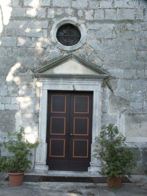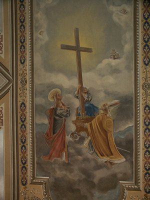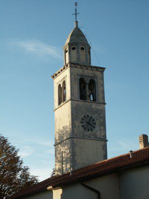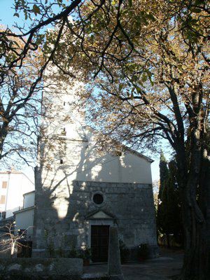 ISCRIZIONE (esterno) Sull'arco acuto dell'ingresso laterale è scolpita la data del 1584, presumibile data di edificazione della chiesa. ISCRIZIONE (esterno) Sull'architrave dell'ingresso principale si legge un'iscrizione dedicata al vescovo Rinaldo Scarlichio che consacrò nel 1628 l'edificio: "Antist(ite) et com(ite) Terg(estimo) Reinaldo Scarlichio an(n)o sal(utis) MDCXXVIII". EPIGRAFE (esterno) Su un concio a destra dell'ingresso principale si legge: "Anno D(omi)ni MDLXX/XIIII mensis Juni XIII / clavigari Marcus Boga/tac [...] Iacob Bosall [...]". AFFRESCO (interno) La volta sopra la navata, trattata a fresco da F. Ferlettig nel 1910, ospita la raffigurazione dell'Invenzione della Croce. STATUE (interno) L'altare maggiore è arricchito dalle statue marmoree raffiguranti S. Rocco, la Madonna, S. Giovanni Evangelista e S. Primo. AFFRESCO (interno) La volta dell'abside è decorata a fresco con la scena di Gesù nell'Orto. AFFRESCO (interno) Sulle pareti orientali delle cappelle laterali l'artista Antonio Jelo?in dipinse nel 1921 la scena della Liberazione di San Pietro e la raffigurazione della Sacra Famiglia. ELEMENTI ORNAMENTALI (interno) Sull'altare destro una pala decorata ad olio da una suora nel 1975 raffigura i Santi Pietro e Paolo, mentre sull'altare sinistro campeggia una statua lignea dedicata alla Madonna con Bambino. ELEMENTI ORNAMENTALI (interno) Alle pareti è raffigurata la Via Crucis in pannelli lignei a bassorilievo.
