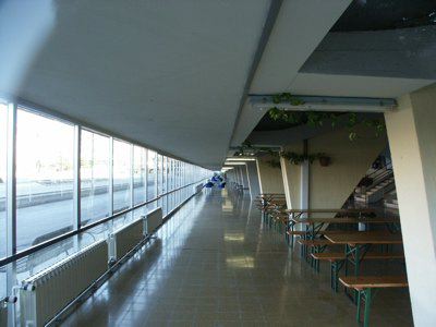 La struttura è completamente trattata in clacestruzzo armato facciavista, dipinto direttamente senza intonacatura. Le superfici vetrate completamente apribili sono in alluminio satinato. Le gradonate esterne ospitano i seggiolini conformati in plastica e le scale si distribuzione alla tribuna sono rivestite in gomma antiscivolo. I parapetti sono costituiti da semplici correnti tubolari sovrapposti verniciati in color marrone. Internamente le superfici sono per lo più spoglie e lasciano leggere pienamente la struttura, che è posta a fondamento del progetto architettonico. La pavimentazione è costituita da marmette colorate di graniglia e cemento al piano terra, da piastrelle in gres porcellanato al primo piano, mentre le scale di accesso ai piani superiori della tribuna sono rivestite in marmo travertino. L'estradosso di copertura è rivestito e impermeabilizzato completamente in guaina ardesiata; l'acqua piovana viene raccolta nella concavità della vela e convogliata a terra in pluviali posti internamente alla struttura in calcestruzzo armato.