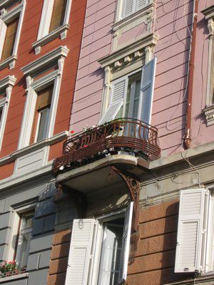 Basamento in finto bugnato rustico a fasce rifinito ad intonaco sui toni color mattone fino al marcapiano del secondo solaio ed abbassamento in lastre di pietra naturale bocciardata. Fascia superiore verticalmente tripartita in intonaco color rosa antico, lavorato liscio nella parte centrale ed a bugnato liscio a fasce ad evidenziare le estremità laterali di facciata. Alto marcapiano modanato in corrispondenza del secondo solaio; più sottile a livello del quarto solaio, aggettante e dentellato alle estremità laterali di facciata. Marcapiano a livello del solaio di sottotetto, sporto di linda intonacato. Copertura piana in guaina ardesiata. Pluviali in metallo verniciato simmetricamente distribuiti in facciata, rientranti nella muratura poco al di sopra della cornice marcapiano del secondo solaio. Fori di apertura ad arco ribassato al piano terreno per il portone d'entrata e per le finestre, rettangolari ai piani superiori per finestre e portefinestre. Archivolti delle finestre a pianterreno evidenziati da bugnato a conci con chiave di volta in rilievo e fori finestra definiti da semplice riquadro liscio e davanzale piano; riquadro liscio anche per le finestre al primo piano, con cornice modanata di collegamento sotto i davanzali delle finestre. Fori finestra dei piani superiori delineati da sottile cornice modanata. Al secondo e quarto piano, finestre riquadrate da edicole in pietra a paraste verticali, con architrave e con davanzale sostenuti da mensoline a volute, decorate da dentelli in corrispondenza dei fori in estremità di facciata; al terzo piano davanzali modanati in pietra inclusi in riquadro piano; al quinto fori finestra collegati da cornice a motivi geometrici e davanzali piani. Portone principale d'entrata inquadrato da edicola in pietra con paraste verticali ed architrave a dentelli sostenuta da mensole a voluta con peducci vegetali; analoga ma semplificata la decorazione delle portefinestre alle estremità laterali di facciata al secondo piano, con accesso a balconcini con struttura portante metallica, mensole e parapetti stile Liberty in ferro. Porta d'ingresso in legno massello a doppia anta con riquadro geometrico nella parte tamponata e specchiatura vetrata protetta da inferriata Liberty con motivi "a colpo di frusta"; sopraluce vetrato ad una specchiatura. Serramenti vetrati a due ante in alluminio verniciato bianco completi di scuri anch'essi in alluminio bianco, montati su controcassa esterna. Disimpegno dell'atrio d'ingresso in piastrelle a motivi geometrici chiari su fondo mattone, presumibilmente originali; breve rampa di accesso in pietra grigia d'Aurisina bocciardata con corrimano metallico non originale. Scala di accesso ai piani a due rampe con gradini in pietra d'Aurisina bocciardata, con corrimano in legno e ringhiera originale a geometrie Liberty in ferro verniciato ocra. Nel disimpegno e nel vano scala principale, murature in intonaco bianco liscio con fascia battipiede rifinita ad intonaco ocra; nei ripiani di scala pavimentazione originale in battuto di graniglia grigio con fascia perimetrale rossa. Nelle rimanenti parti comuni, pavimentazione originale interamente sostituita da piastrelle grigio chiaro, battipiede piastrellato e superfici trattate a solo intonaco bianco. Serramenti interni d'accesso agli appartamenti di varia tipologia, alcuni originali in legno massello. Botola originale di accesso alla copertura in legno verniciato bianco. Dispositivi di illuminazione non originali; impiantistica a vista. Cortile interno con breve rampa d'accesso in cemento e ringhiera metallica originale; superfici delle murature in intonaco bianco liscio. Fori architettonici con sola protezione metallica dalle intemperie e serramenti in alluminio verniciato bianco a due ante, completi di scuri a pianterreno; impiantistica a vista. Pluviali in pvc, grondaie metalliche.