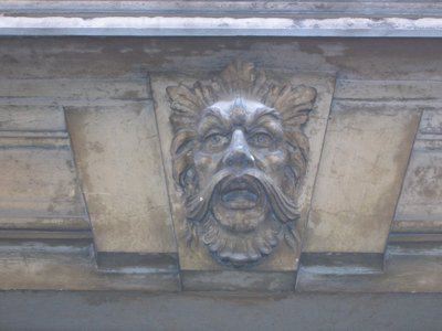 ELEMENTI ORNAMENTALI (esterno): Mascherone in pietra raffigurante forse testa di divinità marina (Nettuno) posto sul concio di chiave del portone principale (Donatello_5010.jpg) ELEMENTI ORNAMENTALI (esterno): Fascia affrescata raffigurante figure marine mitologiche (Tritoni) lungo il marcapiano del secondo solaio (Donatello_5016.jpg)