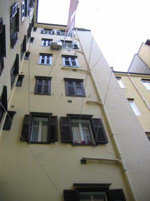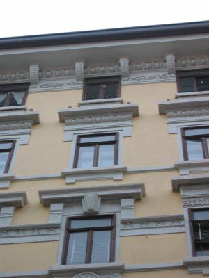 ELEMENTI ORNAMENTALI (esterni): - Targa metallica posta sul lato desto rispetto al portone centrale sopra all'indicazione del civico (Rismondo 040.jpg), dalla datazione non leggibilissima, che riporta la scritta: "ASSICURAZIONI GENERALI - 1831 - TRIESTE". ELEMENTI ORNAMENTALI (interni): - Immagine votiva raffigurante Cristo benedicente (Rismondo 038.jpg), conglobata nell'intonaco della muratura al primo ammezzato del vano scala, con base in legno ed effigie presumibilmente in gesso con finitura colorata.
