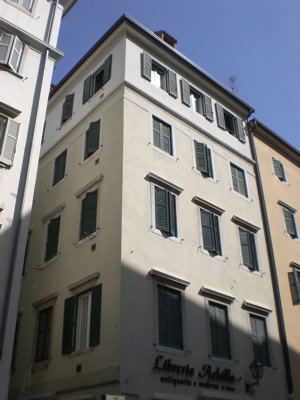 L'edificio sorge all'interno della zona più antica di Trieste, Cittavecchia, modificata negli anni Trenta del Novecento da pesanti interventi avviati con il progetto di sistemazione del colle di San Giusto. Tra gli immobili risparmiati dalle demolizioni rientra l'edificio con affaccio su Piazza Vecchia e Via delle Ombrelle, occupato al piano terra da un locale commerciale e ai piani superiori da abitazioni. In linea con l'antica tipologia architettonica del borgo, la struttura presenta fori finestra e bassi portali ad arco arricchiti da cornici lineari in pietra bianca d'Aurisina e capitelli. Interessante risulta la presenza sulla facciata di Piazza Vecchia di una colonna in pietra a sezione ottagonale, con basamento e capitello, che documenta l'origine antica dell'edificio. Al 1852 risale un primo progetto di modifica sull'immobile che prevedeva l'aggiunta di un quarto piano, come testimonia la presenza in facciata di una cornice marcapiano in pietra. Nel 1913 si intervenne sull'atrio principale, eliminando l'entrata da Via delle Ombrelle, e sull'interno pianoterra per "adattamento ad uso trattoria". Con il "Piano di Recupero", L 457 del 1978, esteso all'intero isolato tra il 1984 ed il 1985, l'immobile è oggetto di importanti modifiche, a firma dell'architetto Franco Stagni, concernenti, in particolare, il restauro degli elementi architettonici esterni.