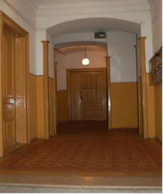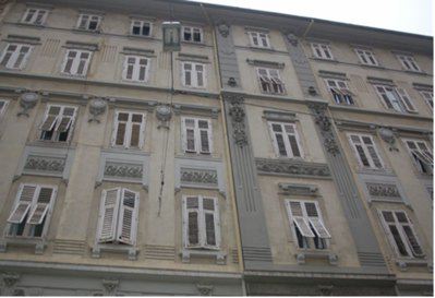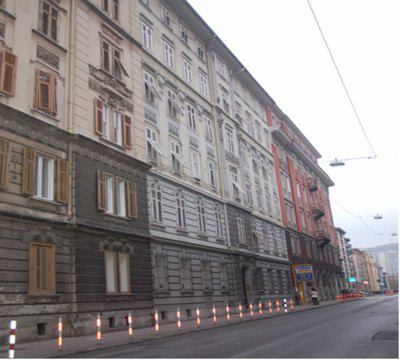 Contemporaneo ad altri sei complessi immobiliari del medesimo isolato, l'edificio viene costruito nella zona di recente urbanizzazione creata dallo sbancamento dei terreni ai piedi del colle di Scorcola; l'area, interessata dalla metà dell'Ottocento dai lavori per la realizzazione della nuova ferrovia cittadina, viene arricchendosi di numerosi edifici multipiano, caratterizzati da un'architettura modernista, essenziale nello sviluppo planimetrico e ricca nella decorazione delle superfici murarie. Il palazzo si affaccia su via Udine, già via Belvedere a ricordo della omonima proprietà distrutta per fare spazio ai nuovi edifici signorili a destinazione residenziale. Il progetto dell'edificio, approvato nel 1905, reca le firme dell'impresa costruttrice "Gobel & Forti", proprietaria del fondo e del "costruttore edile autorizzato" Ferdinando Walenta. In linea con la tipologia architettonica dei coevi palazzi del quartiere, la struttura presente cinque piani fuori terra più soffitta abitabile. La superficie muraria, con basamento rivestito a bugnato liscio, è arricchita da elementi decorativi a rilievo di chiara ascendenza Liberty; motivi floreali e nastri sono collocati in corrispondenza delle specchiature e delle cornici dei fori finestra. L'immobile ha ospitato fino a pochi anni fa la caserma della Guardia di Finanza.
