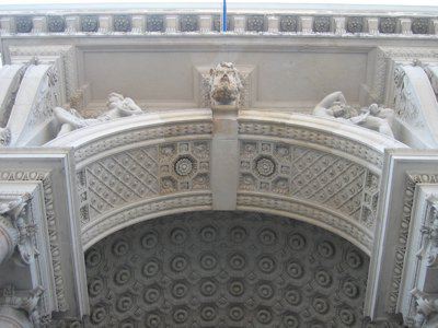 ELEMENTI ORNAMENTALI (esterno): Elementi decorativi a motivi floreali in pietra a rilievo in corrispondenza delle specchiature tra i fori architettonici all'ultimo piano e dello sporto di linda. ELEMENTI ORNAMENTALI (esterno): Chiave di volta a decorazione degli archi a tutto sesto, raffigurante volto di uomo scolpito in pietra. MENSOLE (esterno): Mensole a voluta in pietra a sostegno dei balconi e dello sporto di linda. BALAUSTRE (esterno): Parapetto dei balconi in pietra con balaustrini ad anfora. STATUE (esterno): Statue poste in corrispondenza dell'ammezzato nelle lunette della facciata principale raffiguranti le personificazioni di Fuoco e Aria, Pensiero e Azione, Acqua e Terra, eseguite dallo scultore Giovanni Mayer. STATUE (esterno): Statue poste in corrispondenza del secondo piano della facciata principale raffiguranti le personificazioni della Previdenza e della Protezione, eseguite dallo scultore Gianni Marin.