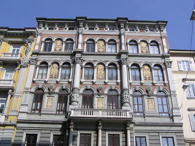 Giovanni Andrea Berlam, nel 1879, realizzò questo edificio sul proprio fondo e con l'intervento anche del figlio Ruggero nell'ideazione della struttura, in particolare per quanto riguarda il prospetto principale. Nel 1886 fu presentato all'Ufficio tecnico comunale un progetto di ampliamento dello stabile con un corpo a due piani, indicato come "Edificio con Pinacoteca". Dal 1887 l'edificio ospitò la sede del Circolo Artistico di Trieste e, fino alla prima guerra mondiale, il Conservatorio Giuseppe Verdi. Gli elementi architettonici riferibili ad esempi medievali e rinascimentali, quali la ricca decorazione della superficie parietale, si devono all'idea del venticinquenne Berlam. La facciata su Via Carducci è arricchita da colonne e lesene, archi a tutto sesto e motivi decorativi quali ghirlande, festoni e gruppi scultorei.
