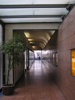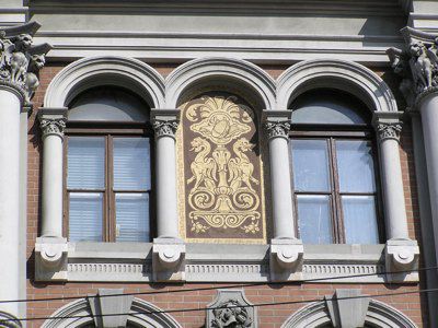 L'edificio, a cinque piani fuori terra, presenta una facciata ripartita verticalmente in tre sezioni. Il basamento presenta un rivestimento a bugnato mentre i piani superiori sono distinguibili per il fondo in finto mattone. La superficie del pianoterra e del primo piano è caratterizzata nella parte centrale da una leggera soprgenza, mentre nei piani superiori l'articolazione è messa in evidenza da semicolonne e lesene angolari. A movimentare la facciata superiore intervengono una serie di aperture a tutto sesto; dal terzo livello le finestre sono im preziosite da elegnati decorazioni monocrome a grottesca e da riquadri con festoni di foglie e frutta a rilievo di chiara ispirazione rinascimentale. Figure di putti danzanti spiccano alla base delle semicolonne centrali del piano nobile. Rilievo assumono i tre stemmi con soggetti coronati d'allora posti in facciata.
