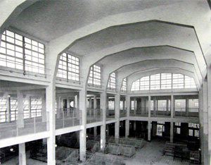 Così esordiva, nel gennaio 1935, la Rivista Mensile della città di Trieste: "Vecchissima aspirazione quella dei Mercati coperti, a Trieste, non tanto per ragioni di igiene e salubrità pubblica quanto per ragioni climatiche. Ogni anno l'opinione pubblica si avvedeva che i Mercati all'aperto nella stagione invernale erano un guaio, che ogni precipitazione di pioggia era dannosa, che il vento, sollevando la polvere della strada, incipriava frutta e verdure di sostanze non sempre innocue, senza contare il disagio dei venditori e quello del pubblico affluente ai mercati stessi". La realizzazione di un Mercato rionale coperto risolveva così un annoso e delicato problema di salute ed igiene pubblica. La vasta area prospiciente l'antica via del Torrente, che dal 4 novembre 1918 prese il nome di via Carducci, venutasi a creare in seguito alle demolizioni dei vecchi fabbricati lì esistenti, fu destinata, quindi, alla creazione del nuovo fabbricato. L'edificio, progettato nel 1935 dall'arch. Camillo Iona, allora tecnico dell'Ufficio Lavori Pubblici del Comune, si indirizzò subito verso un'ampia struttura, moderna e funzionale, capace di ospitare più di 300 banchi di vendita. Descritto come interessante esempio di "architettura funzionalista", il Mercato coperto si inseriva all'interno di una politica urbanistica di regime, volta alla realizzazione di importanti opere cittadine. Nonostante l'iniziale perplessità derivata, non solo dallo svuotamento che si sarebbe venuto a creare nelle piazze destinate solitamente ai mercati, ma anche dalla prevista riduzione di clienti dovuta all'ubicazione meno centrale della struttura, il podestà Salem ne decretò l'immediata costruzione. Due i livelli: uno, al pianterreno rialzato, destinato ad accogliere i venditori di frutta e verdura che fino ad allora erano stati ubicati in piazza Goldoni e Garibaldi ed una galleria superiore, raggiungibile attraverso una rampa elicoidale e due rampe di scale, per la vendita di fiori e merci stagionali. La struttura che ne derivò, semplice ed essenziale, in stile Novecento, trovò, nella singolare forma tondeggiante, nella caratteristica torre dell'orologio, negli ampi spazi interni e nelle grandiose vetrate a nastro, la propria funzionalità ed utilità. L'essenzialità delle linee e l'utilizzo di materiali sperimentali (calcestruzzo, vetro-cemento e nuovi materiali compositi) resero subito innovativo ed esplicito il progetto. L'ottimo sistema di illuminazione naturale, la ventilazione, l'isolamento termico, il particolare rivestimento delle pareti (lavabili e di colore azzurro per evitare il problema delle mosche), resero la costruzione il risultato di altrettante esperienze internazionali in questo settore. Così la sua descrizione: "l'edificio ospita un mercato coperto ed occupa un vasto lotto triangolare, ad isola, di un'area del centro storico, parzialmente demolita agli inizi degli anni Trenta. La fabbrica si eleva di 3 piani fuori terra; l'angolo risolto con una scala ellittica che sale a spirale, leggibile dalle finestre a nastro intelaiate in ferro, è più alto e termina con la torre dell'orologio. Ampie superfici vetrate definiscono gli alti prospetti. La struttura portante è costituita pilastratura in cemento armato e laterizio; la copertura è piana. I prospetti sono finiti con intonaco liscio". I lavori, iniziati il 14 ottobre, si conclusero dodici mesi dopo con un piccolo ritardo sui tempi iniziali, stimati attorno ai dieci mesi. Il collaudo delle opere in cemento armato fu effettuato meno di anno più tardi: il 7 ottobre 1936. Inaugurato il 28 ottobre 1936 alla presenza del Duca Amedeo d'Aosta, del Prefetto, del Podestà e delle massime autorità cittadine, l'edificio, costato al Comune circa due milioni di lire, fu ufficialmente aperto al pubblico il 16 novembre dello stesso anno.