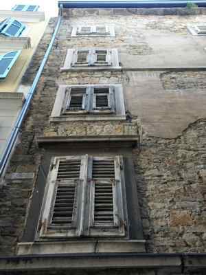 FACCIATA SU VIA BECCHERIE Basamento in pietra bianca bocciardata, rivestimento della fascia al piano terra in pietra bianca bulinata in corrispondenza del locale commerciale. Fori al piano terra con cornici arcuate in pietra bianca bulinata, decorate da chiavi di volta con volute in pietra. Architrave orizzontale sviluppato su tutta la lunghezza di facciata. Al centro un'iscrizione parzialmente leggibile (forse "MACELLERIA"). Sopraluce protetti da inferriate in ferro battuto. In corrispondenza del sopraluce del foro centrale, una lanternina in ferro battuto ed un'iscrizione recante la data 1851 (Pict0001.jpg). Banchina su mensole squadrate in pietra bianca a livello del primo orizzontamento, a protezione dell'ingresso al locale commerciale. Superficie di facciata trattata ad intonaco con marcapiano intonacato in corrispondenza del solaio del terzo piano. Serramenti oscuranti esterni in legno uso Trieste, montati su cornici in pietra bianca bulinata, con architrave a mensola al primo piano, architrave semplice ai piani superiori. Gronda e pluviale in lamiera. FACCIATA SU ANDRONA DEL PANE: Facciata trattata ad intonaco su tutta l'altezza. Fori architettonici con cornici semplici in pietra bianca bulinata. Porta di ingresso al piano terra in legno massello verniciato. Serramenti esterni dei piani superiori in legno senza oscuranti, ad otto specchiature con apertura a ghigliottina. INTERNO Scala con pianerottoli e gradini in lastre di pietra bianca bulinata e corrimano in ferro. Serramenti interni lignei e pavimenti in doghe di legno.