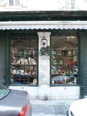 Basamento della facciata principale in pietra bianca bulinata. Paraste rifinite ad intonaco scandiscono il ritmo di facciata. Serramenti vetrati in legno a specchiatura unica di grandi dimensioni, ritmati da colonnine in ghisa verniciate con capitello in stile corinzio. Serrande metalliche e cassonetto superiore in legno. Fanali metallici di recente fattura ancorati alle paraste sulla facciata principale. Facciate laterali rifinite ad intonaco.