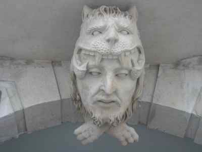 PANDURO (esterno) Il panduro collocato in chiave d'arco della Portizza raffigura un Ercole incappucciato da una testa di leone, con le zampe incrociate sotto al mento BASSORILIEVI (esterno) Un fregio a bassorilievo con motivi vegetali e allegorici corona la parte superiore del tetto. Le Lunette delle finestre del primo piano sono decorate con dei motivi allegorici a bassorilievo.